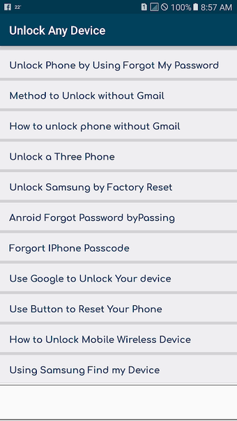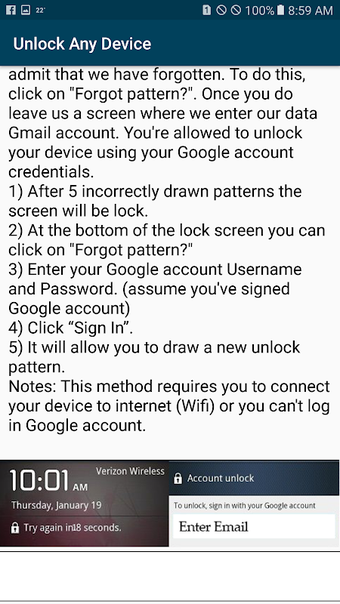 This app is designed to provide an easy and quick guide to anyone who is facing the same issue as you, that is, how to unlock his/her phone. There are several methods to do this and the first thing you have to do is to try them all. However, if you don't know how to unlock your device, you will be unable to do this. In such cases, you will need to look for a guide or a tutorial on the Internet. The good thing is that there are many of them and you can find one that will help you.